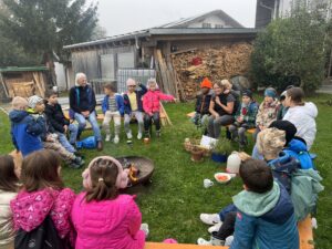 Am zweiten Tag stand für zwei Kombiklassen das Apfelprojekt auf dem Programm. Die Klasse 1/2b war zu Gast bei Familie Rosenauer, wo die Kinder die dort lebenden Hühner mit Küken, Hasen und das große Freigehege kennenlernen durften. Bei einer kleinen Kräuterkunde entdeckten sie heimische Pflanzen, und als krönenden Abschluss backten sie ihre eigene Pizza im Steinofen – frisch, gesund und köstlich.